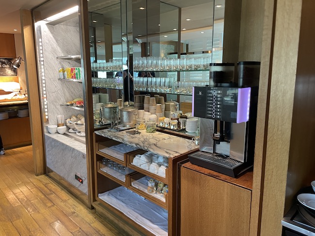 The lounge has offers food and drinks twice a day (breakfast and evening) but access to the coffee maker, water and sodas is available all day long.